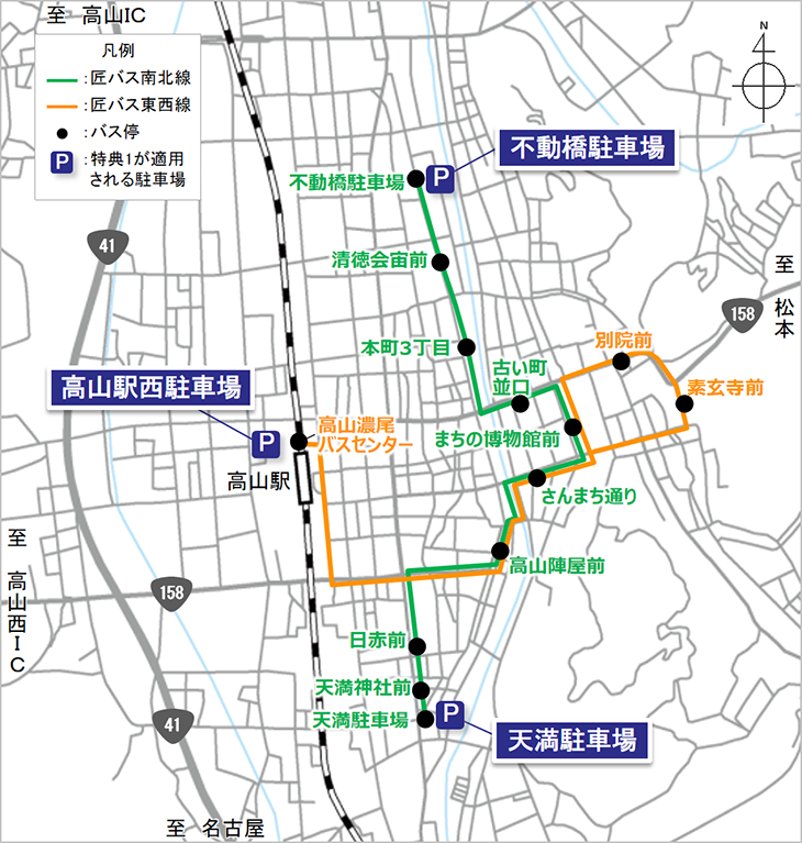 「不動橋駐車場」・「天満駐車場」・「高山駅西駐車場」に駐車し、匠バスをご利用いただいた際は、